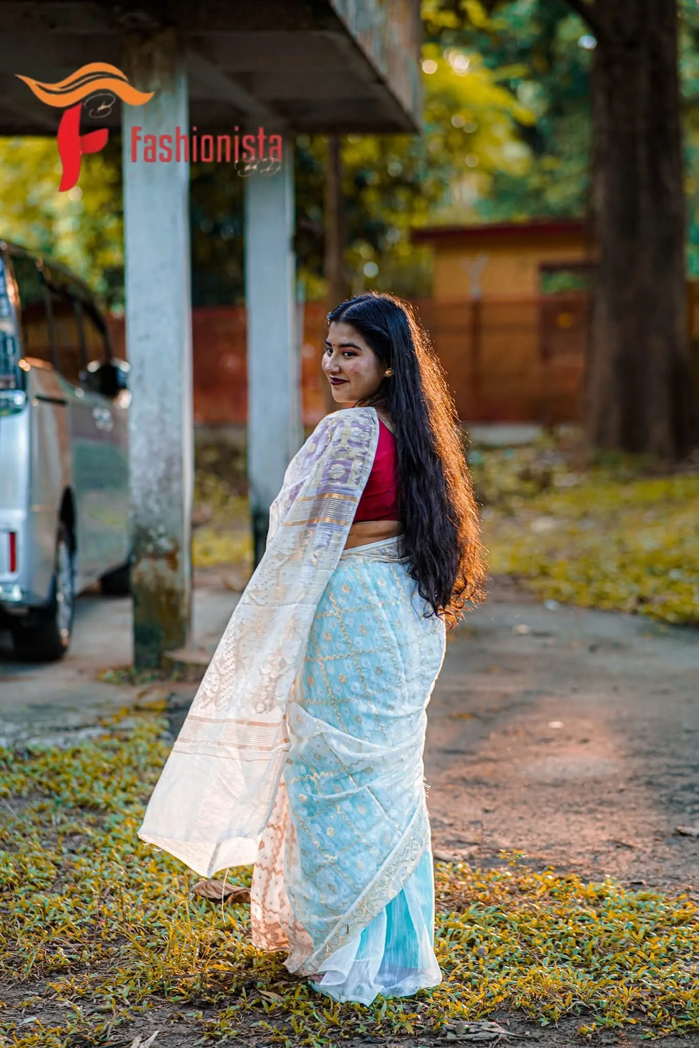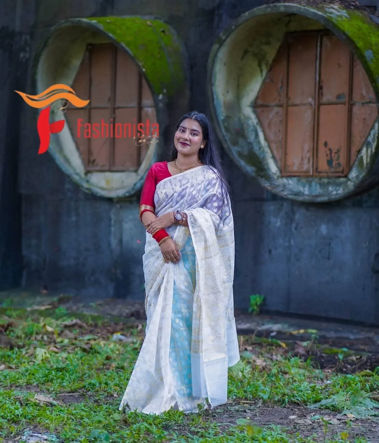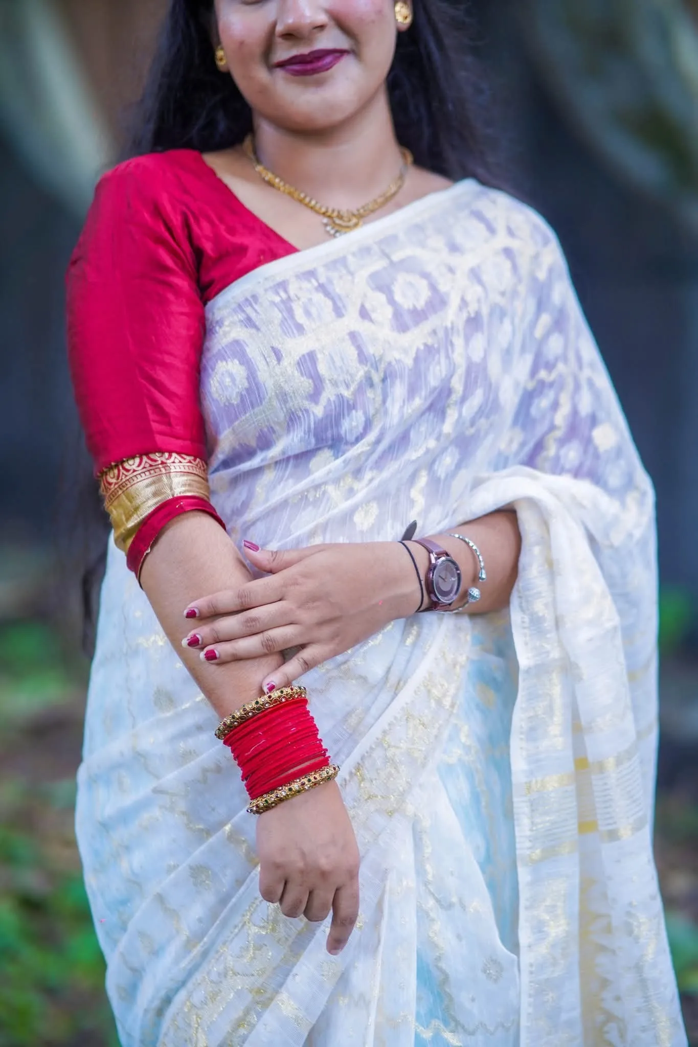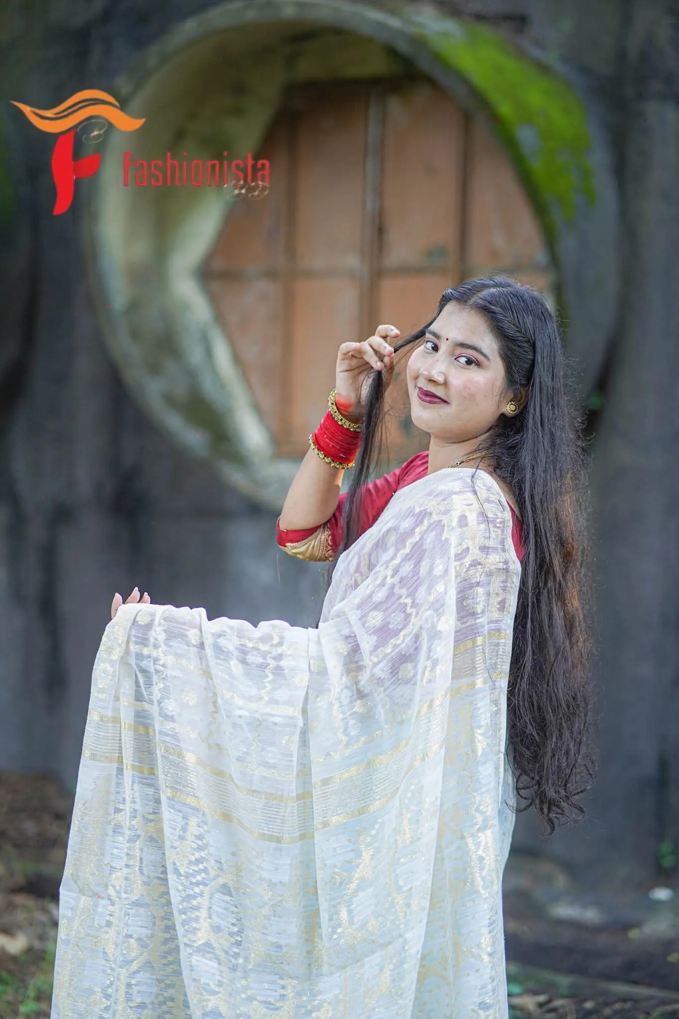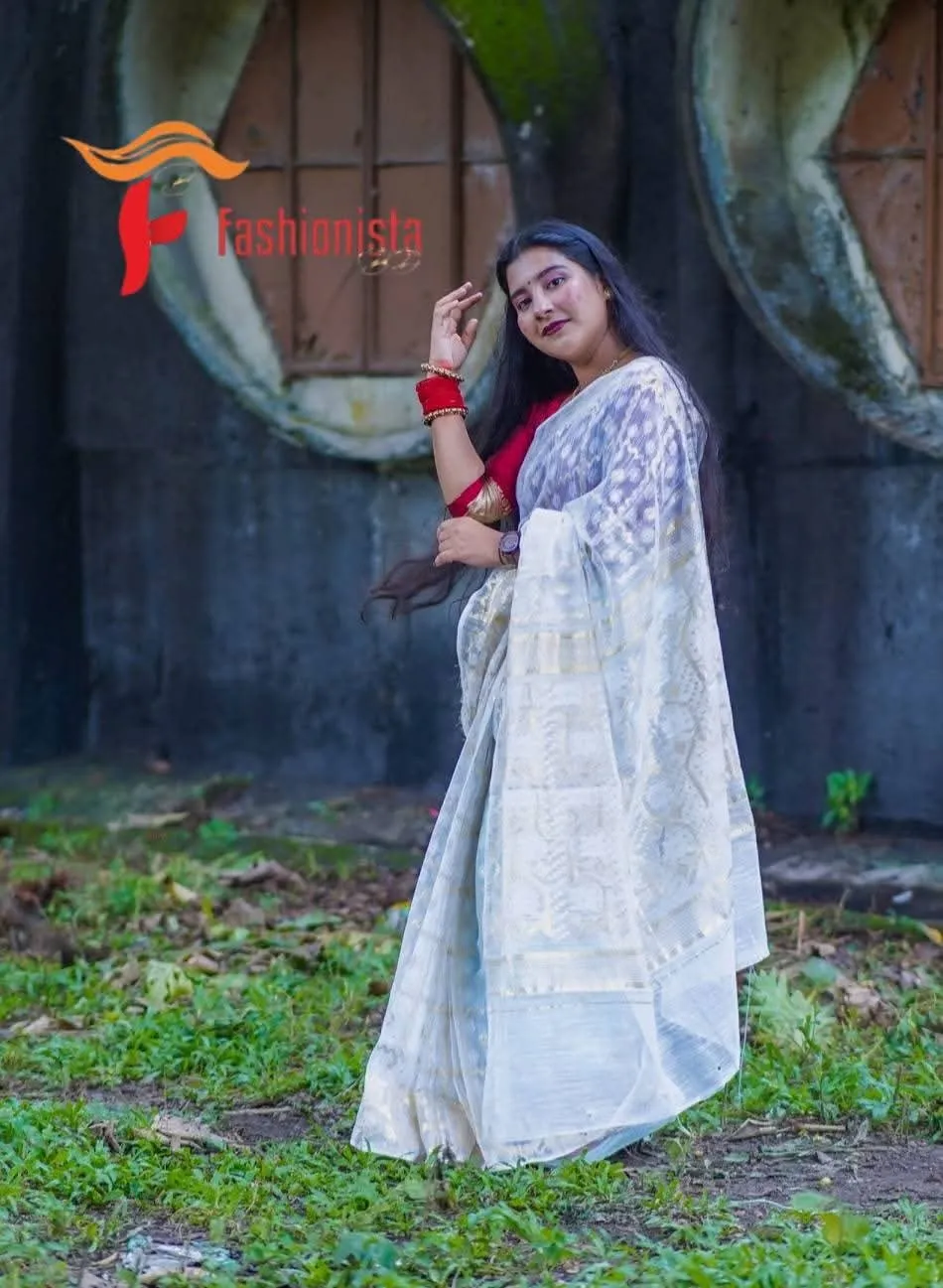এই জামদানি শাড়িটি সিল্ক বা কনট্রাস্ট ডিজাইনের ব্লাউজের সাথে পরলে আপনার লুক হবে আরও বেশি আকর্ষণীয় ও রাজকীয়।